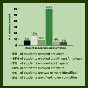 Minority enrollment increased slightly from fall 2023’s 38.3% to fall 2024’s 39.7%. African American students make up 16%, Hispanic students make up 9%, and Asian students make up 8%. Students who identify as two or more ethnicities make up 6%. White students are the majority, with 60% of student enrollment.